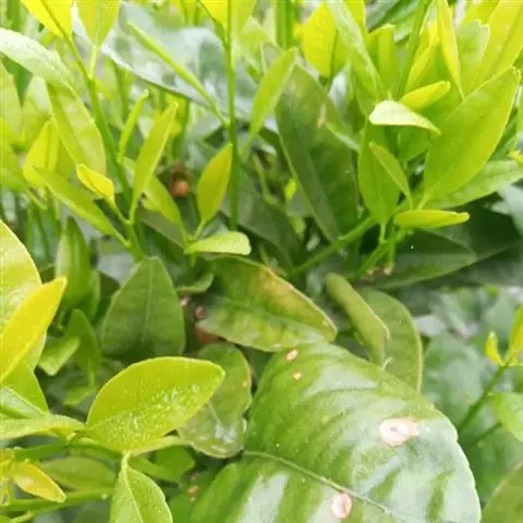溃疡病为害叶、枝稍和果实,造成落叶落果,叶背始呈黄色渍状小斑点,以后逐渐扩大呈近园形,两侧隆起,粗糙木质化,其中央有裂口,最后为灰褐色,成溃疡状,四周有黄色晕环,严重者引起落叶,溃疡病菌随风雨传播,在20至30℃和湿润气侯发生最为严重。