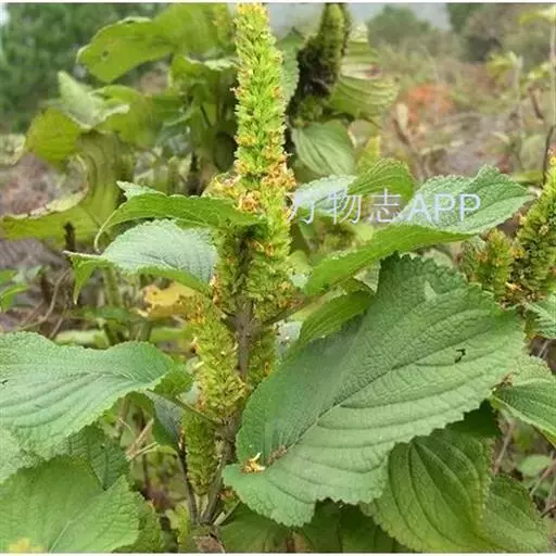 茎呈方柱形,长15-40cm,常从基部分枝,表面紫红色,被短柔毛;质脆。叶多卷曲皱缩,展平后呈长圆形或卵状长圆形,长0.8-4cm,宽0.3-1.5cm,上面黄绿色,被柔毛;叶柄长0.1-1cm,密被柔毛。顶端常有假穗状花序,花黄棕色。气清香,味辛凉。