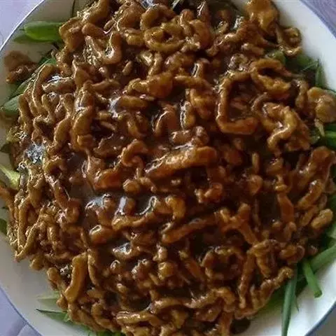 京酱肉丝,是一道知名度很高的菜肴,它是北京菜中的经典代表菜之一。制作时选用猪瘦肉为主料,辅以甜面酱…