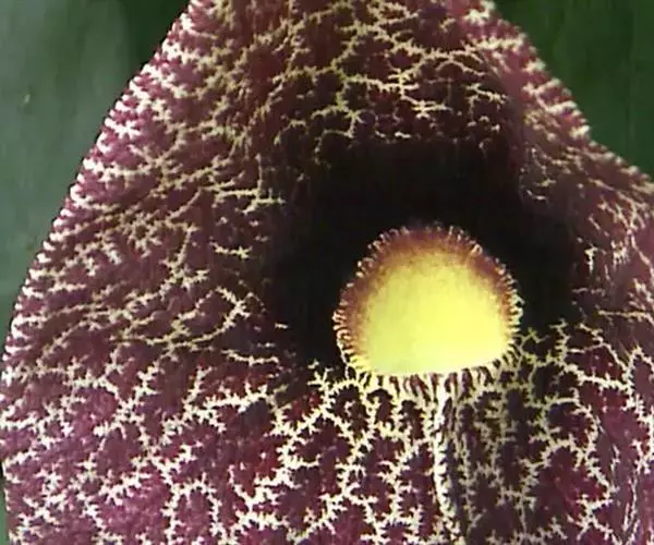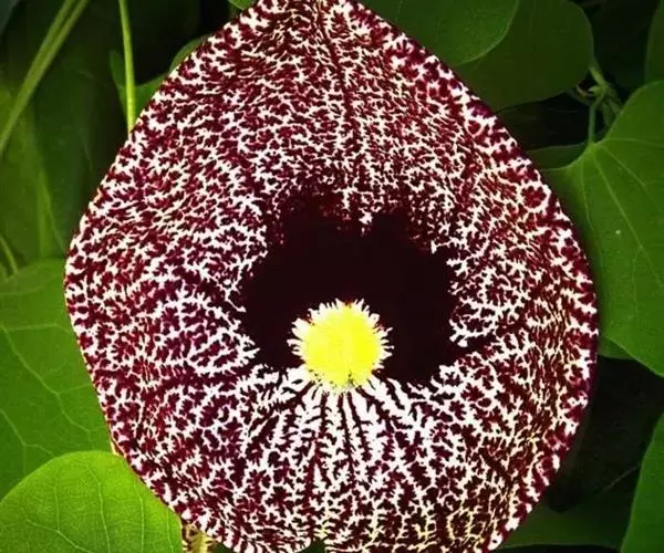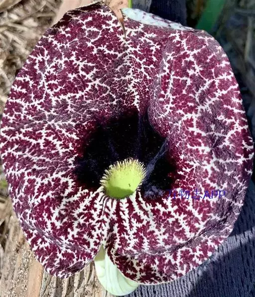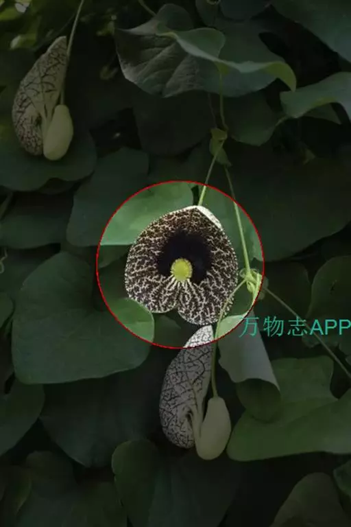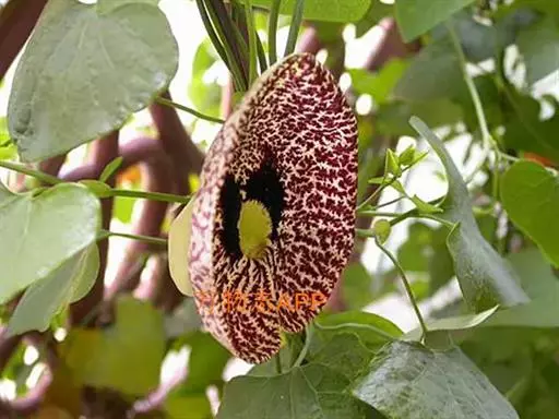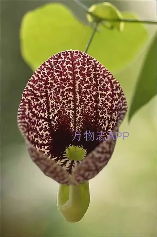 美丽马兜铃开花照 花单生于叶腋,花柄下垂长10~12厘米,先端着一花;花被合生,向上弯曲,呈喇叭状;未开放前为一气囊,形似饺子,长10厘米,宽4厘米,有紫褐色脉纹,花被筒基部膨大,中部细,上部扩大成喇叭形,黄绿色;全朵自下而上呈“S”形弯曲,造型奇特,十分别致。开花时沿中缝裂开,呈长椭圆形,内满布深紫色斑点,喇叭口处有一半月形紫色斑块,很是显眼。子房下位,蒴果长圆柱形,成熟时黑褐色,6个心皮由花柄处裂开,将花柄一分为二,呈吊篮状悬挂在空中,甚是好看。种子深褐色,呈等腰三角形,有膜翅。开花时发出浓烈臭味,引得蚂蚁等昆虫前来为其授粉。花期5~9月,果期6~10月。