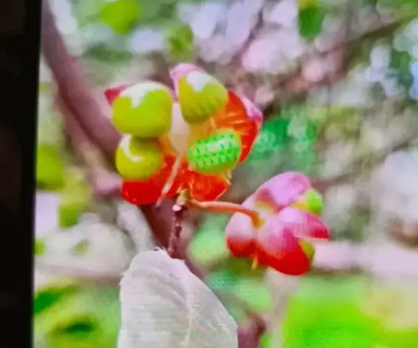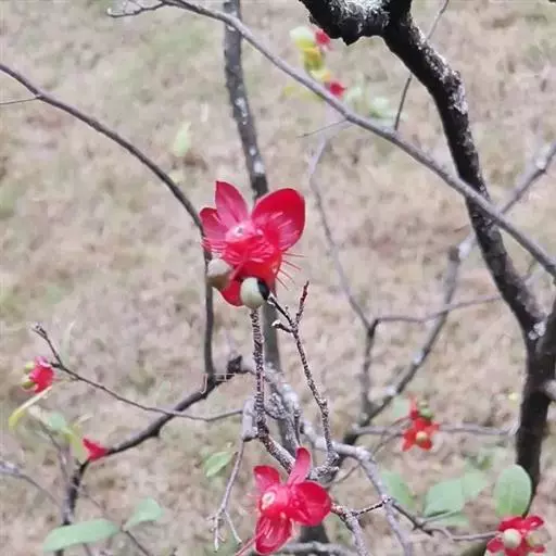 花序近伞房状,长约4厘米,生于短枝的顶部;花直径达、3厘米,花柄长1.5-3厘米,近基部有关节;萼片长圆形,长1-1.4厘米,顶端钝,开放时外反,结果时呈暗红色;花瓣5片,有时7片,倒卵形,长1.3-2厘米,顶端钝或圆;雄蕊长0.9-1.2厘米,3轮排列,花丝宿存,长5-8毫米;子房10-12室,花柱圆柱形,柱头盘状,5-6裂。核果长10-12毫米,宽6-7毫米,顶端钝,基部微弯。花期3-4月,果期5-6月。