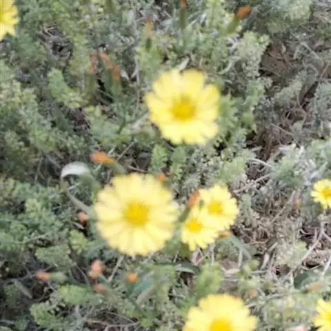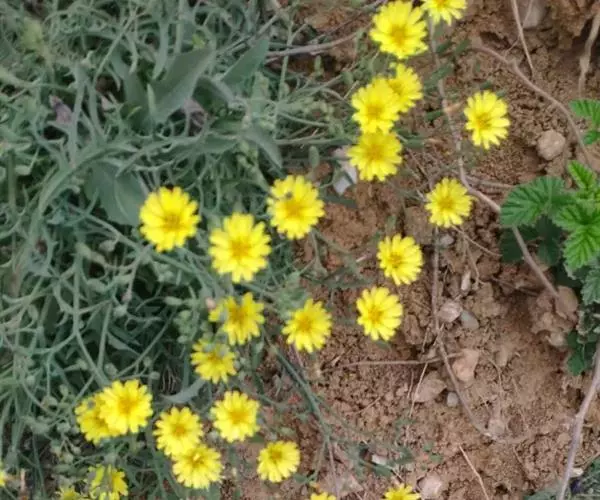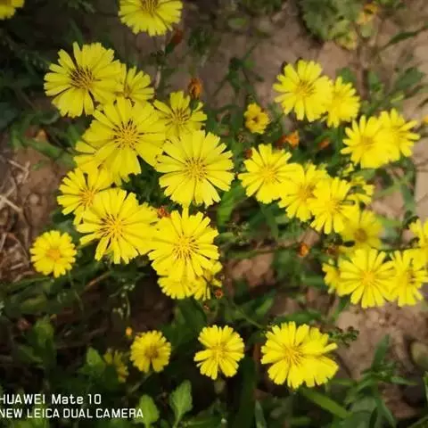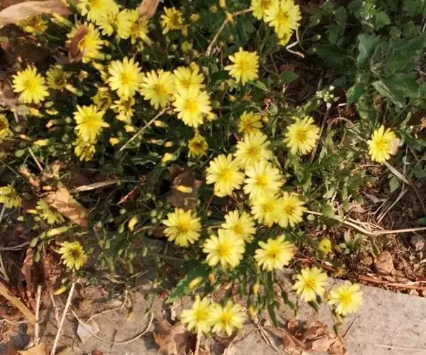 头状花序多数,在茎枝顶端排成伞房状花序,花序梗细。总苞圆柱状,长5-7毫米,果期扩大成卵球形;总苞片3层,外层及最外层极小,卵形,长0.5毫米,宽0.2毫米,顶端急尖,内层卵状披针形,长7毫米,宽2-3毫米,顶端急尖或钝,外面近顶端有鸡冠状突起或无鸡冠状突起。舌状小花黄色,极少白色,10-25枚。瘦果压扁,褐色,长椭圆形,长2.5毫米,宽0.8毫米,无毛,有10条高起的尖翅肋,顶端急尖成长1. 5毫米喙,喙细,细丝状。冠毛白色,白色,纤细,微糙,不等长,长达4毫米。花果期3-6月。