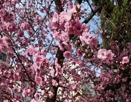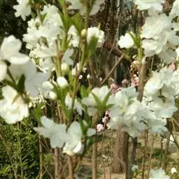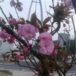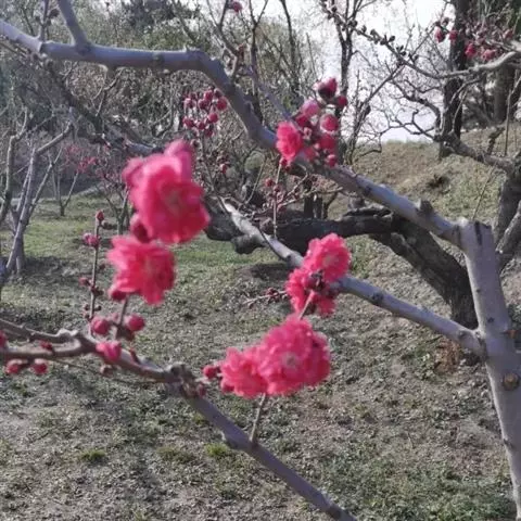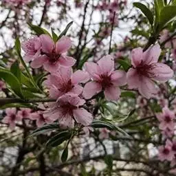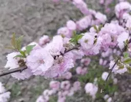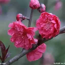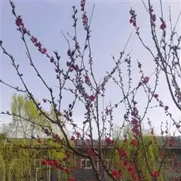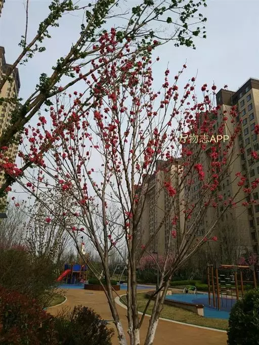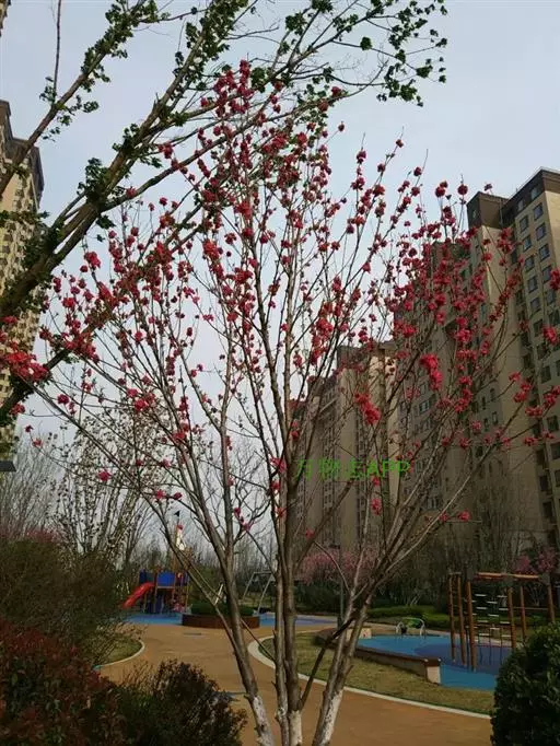 属于观赏桃花类的半重瓣及重瓣品种,统称为碧桃。华东地区碧桃花期是3月~4月,花朵丰腴,色彩鲜艳丰富,花型多。常见的品种有红花绿叶碧桃、红花红叶碧桃,白红双色洒金碧桃等多个变种。碧桃具有很高的观赏价值,在小区、公园、街道随处可见的美丽植物。