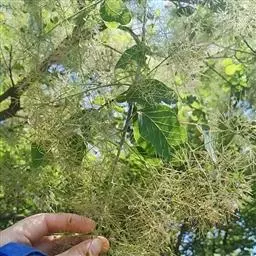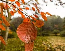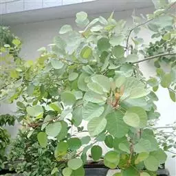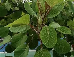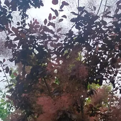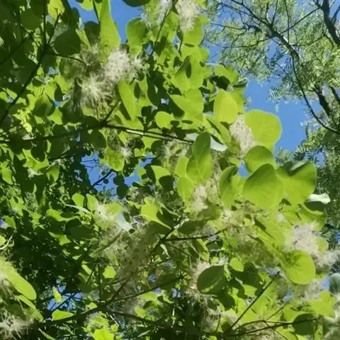 粉背黄栌叶卵圆形,较大,长3.5-10厘米,宽2.5-7.5厘米,无毛,但叶背显著被白粉;叶柄较长,…