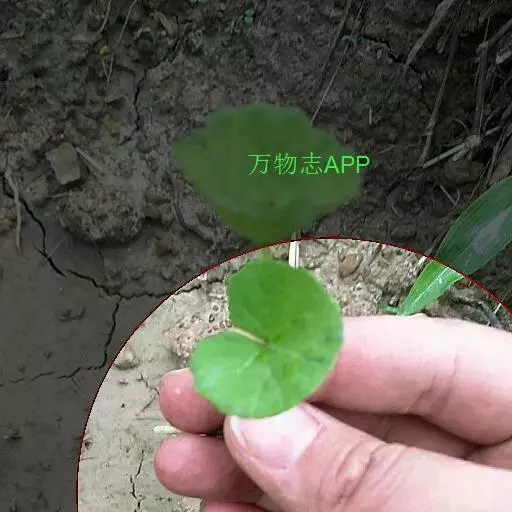 多年生匍匐小草本,茎细长,被灰色短柔毛,节上生根。叶肾形至圆形,直径4-25毫米,先端宽圆形或微缺,基部阔心形,叶面微被毛,背面被贴生短柔毛,全缘;具长的叶柄,叶柄长(1.5)3-5(6)厘米。