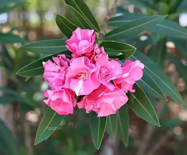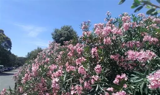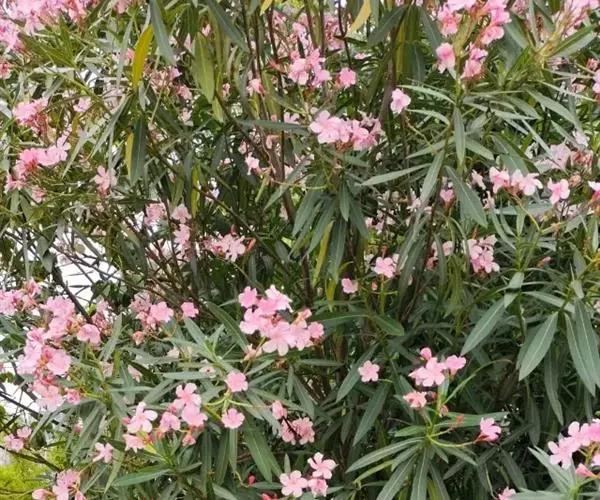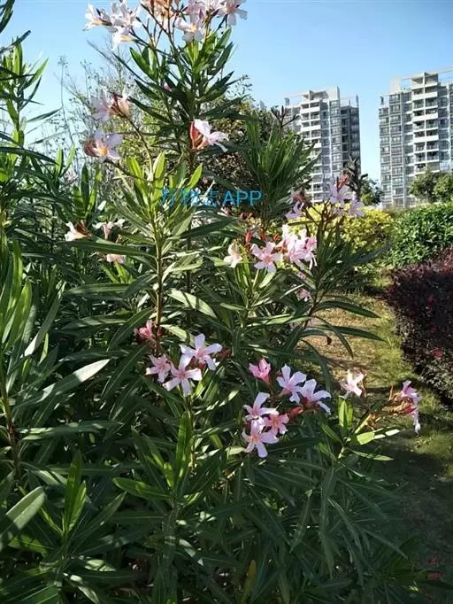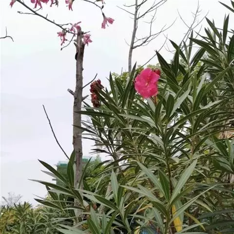 夹竹桃的叶片如柳似竹,红花灼灼,胜似桃花,花冠粉红至深红或白色,有特殊香气,花期为6-10月,是有名的观赏花卉。
