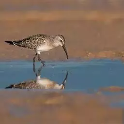 勺嘴鹬(学名名:Eurynorhynchus pygmeus)是鹬科勺嘴鹬属鸟类,小型涉禽,体长14-16厘米。嘴黑色,嘴基平扁,先端扩大呈铲形。夏季上体黑色,具棕红色羽缘。头、颈、胸棕红色,胸具黑色斑点,其余下体白色。冬羽背面灰褐色,具黑褐色羽轴纹。额和眉纹白色,贯眼纹黑褐色。下体白色,胸侧具黄褐色纵纹。飞行时翅上有一窄的白色翼带,腰和尾上覆羽两侧白色,中央黑色。觅食时用嘴在水中或烂泥中像扫帚一样左右来回扫。据此特征和它那呈铲形的黑色嘴,在野外很容易地就能与其他鹬类区别开来。