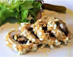 5、加入香菇,胡萝卜,倒入腌排骨剩下的调味汁和蚝油、盐翻炒片刻即可,出锅前将蒜米挑出来。