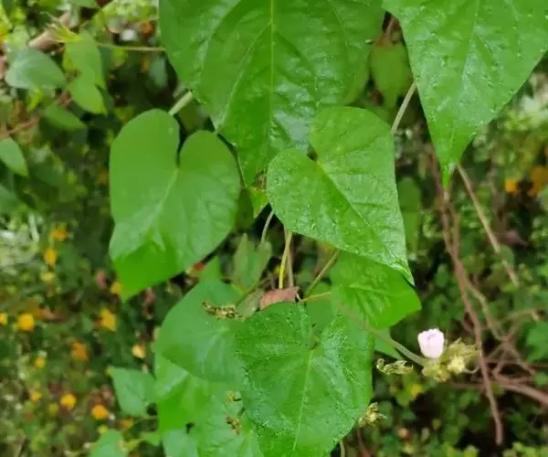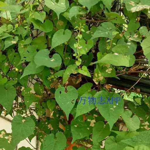 缠绕草本,植株各部分近于无毛。茎圆柱状,具细棱。叶卵状心形,长3~13厘米,宽1.7~7.5厘米,顶端长渐尖或尾状渐尖,基部心形,全缘或稍波状,侧脉7~9对,纤细,近于平行射出,近边缘弧曲向上;叶柄长2~7厘米,基部具小耳状假托叶。聚伞花序腋生,有(1~)3~7朵花,花序梗通常比叶柄短,有时超出叶柄,长1~6.5厘米,明显具棱或狭翅;苞片小,线形;花梗长0.3~0.9(~1.5)厘米,向上增粗;萼片椭圆形,近于相等,长0.5~0.7厘米,顶端明显具钻状短尖头,无毛;花冠淡红色,钟状,长1.2~1.9厘米,无毛,冠檐具三角形裂片;花药不扭曲;子房无毛,2室。蒴果近球形,顶端圆,高5~7毫米,无毛,4瓣裂。种子4或较少,黑色,椭圆状三棱形,顶端钝圆,长3~4毫米,无毛。 花果期夏、秋季。
