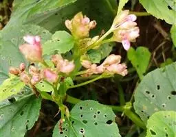 花葶高26-32厘米,细弱,有纵棱,无毛;花白色至粉红色,有花8-10朵,呈二歧聚伞花序,首次分枝长2-3厘米,二次分枝长1.6-2厘米,均无毛;苞片早落;雄花:花梗长8-10毫米,无毛,花被片4,外轮2枚大,扁圆形,长约10毫米,宽约13毫米,先端圆,内轮2枚小,倒圆形或椭圆形,长约8毫米,宽约6毫米,先端圆钝;雄蕊多数,整个呈球状,花丝长0.8-1毫米,花药长圆形,顶端钝;雌花:花梗长1.5-2厘米,花被片5,子房卵状长圆形,无毛,3室,每室胎座具2裂片,花柱3,2裂,柱头螺旋状扭曲并带刺状乳头。