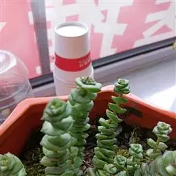 红稚儿Crassula pubescens subsp. radicans Toelken为景天科、青锁龙属多肉植物。植株丛生,有细小的分枝,茎肉质,时间养久了茎会逐渐半木质化,红稚儿叶片有点薄,叶片颜色绿。颜色反差巨大,平时为绿色,日照充足的春秋季节,变为火红色。野外分布于南非东开普省布什维德谷。喜温暖干燥和阳光充足的环境,怕低温和霜雪,耐半阴。叶形叶色较美,有一定的观赏价值;盆栽可放置于电视、电脑旁,可吸收辐射,亦可栽植于室内以吸收甲醛等物质,净化空气。