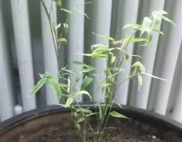 凤尾竹 Raeusch. ex Schult. ’Fernleaf’ R. A. Young)是禾本科,簕竹属孝顺竹的变种。植株较高大,杆高可达6米,竿中空,小枝稍下弯,下部挺直,绿色;竿壁稍薄;节处稍隆起,无毛;叶鞘无毛,纵肋稍隆起,背部具脊;叶耳肾形,边缘具波曲状细长繸毛;叶舌圆拱形,叶片线形,上表面无毛,下表面粉绿而密被短柔毛,小穗含小花,中间小花为两性;外稃两侧稍不对称,长圆状披针形,先端急尖;内稃线形,脊上被短纤毛,花药紫色,子房卵球形,羽毛状。成熟颖果未见。原产中国,华东、华南、西南以至台湾、香港均有栽培。凤尾竹喜温暖、湿润和阳光充足的环境,耐寒。宜土层深厚、肥沃、疏松的微酸性壤土。该种观赏价值较高,宜作庭院丛栽,也可作盆景植物。全草或根入药,味淡、微苦,性寒,有清热利湿、凉血止血、消肿解毒功效,可治痢疾、泄泻等多种病症。凤尾