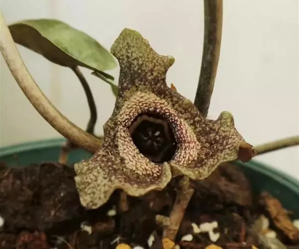 花紫绿色,直径5-6厘米;花梗长约1厘米;花被管浅杯状或半球状,长约1.4厘米,直径约2厘米,喉部稍缢缩,有宽大喉孔,喉孔直径约1.5厘米,膜环不明显,内壁有格状网眼,花被裂片宽卵形,长约2厘米,宽约2.5厘米,基部有半圆形乳突皱褶区;雄蕊药隔伸出,钝圆形;子房近上位,花柱顶端Z裂或稍下凹,柱头卵状,侧生。花期4-5月。