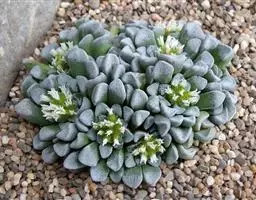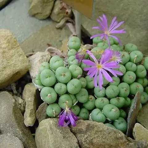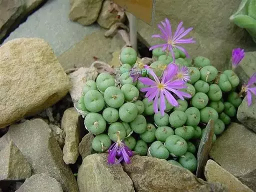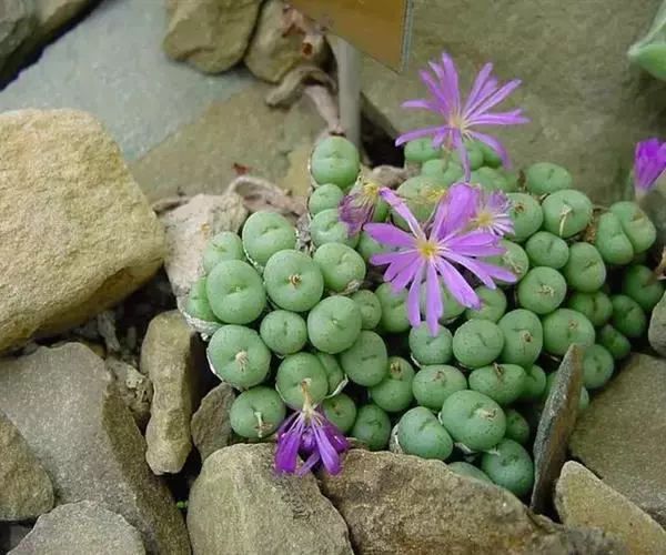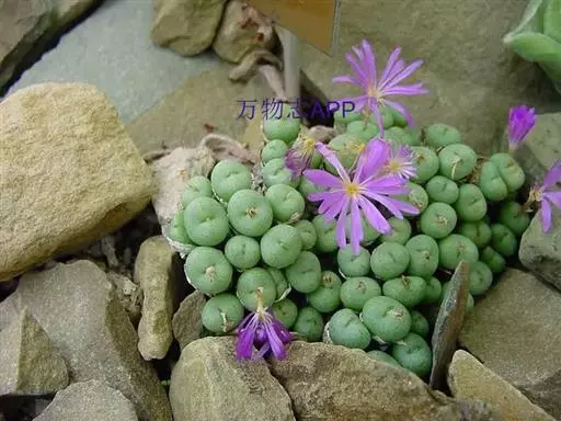 多肉植物,植株群生,具极端内质的对生叶,叶绿色,无花纹,顶面平坦,中央有浅缝,每年的秋季从浅缝中开出紫红色花朵,花朵通常在阳光充足的白天开放,榜晚闭合,如此昼开夜闭,单花能开放5-7天,如果栽培环境光照不足或阴天则不能开放。 群碧玉