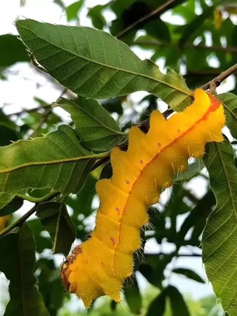 柞蚕,是鳞翅目大蚕蛾科柞蚕属一种吐丝昆虫。其身体及翅黄褐色,头棕褐,…