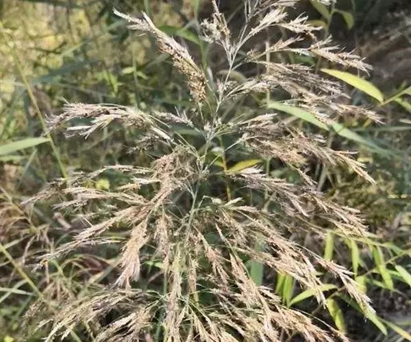 圆锥花序大型,长20-40厘米,宽约10厘米,分枝多数,长5-20厘米,着生稠密下垂的小穗;小穗柄长2-4毫米,无毛;小穗长约12毫米,含4花。颖具3脉,第一颖长4毫米;第二颖长约7毫米。第一不孕外稃雄性,长约12毫米,第二外稃长11毫米,具3脉,顶端长渐尖,基盘延长,两侧密生等长于外稃的丝状柔毛,与无毛的小穗轴相连接处具明显关节,成熟后易自关节上脱落;内稃长约3毫米,两脊粗糙;雄蕊3,花药长1.5-2毫米,黄色;颖果长约1.5毫米。