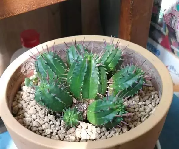 苏铁大戟:俗称“铁甲丸”。多年生的多肉植物,茎干深褐色,样似苏铁的茎干,茎干初期为绿色球型,…