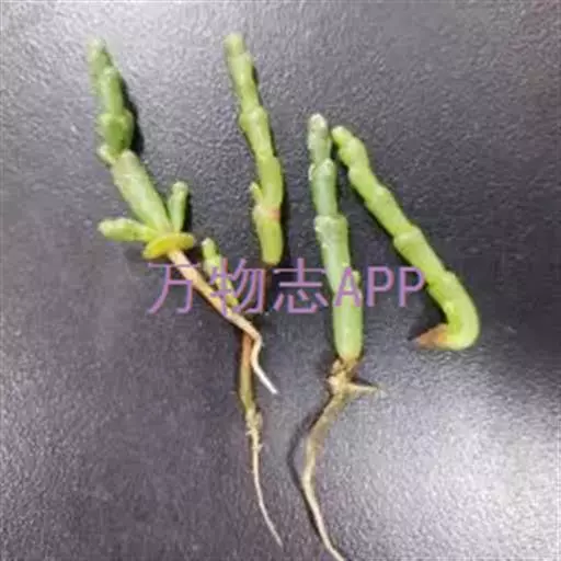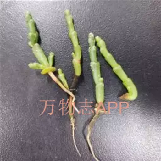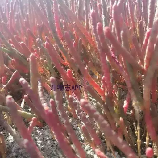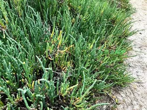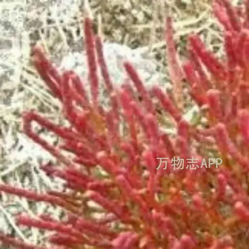 盐角草 一年生草本,高10-35厘米。茎直立,多分枝;枝肉质,苍绿色。叶不发育,鳞片状,长约1.5毫米,顶端锐尖,基部连合成鞘状,边缘膜质。