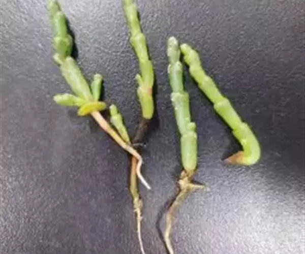 盐角草 播种10天左右种子开始萌发,20天左右幼苗基本出齐。由于沿海滩涂土壤比较湿润,基本不用浇水,地势高的地方,可以适当用海水浇灌。待幼苗长至15厘米左右,开始间苗,间除的嫩苗作为新鲜蔬菜和深加工蔬菜原料。苗期施用以氮肥为主的肥料1-2次,使幼苗茁壮生长。开花后,可适当施磷钾肥,促使开花结果,提高结实率。