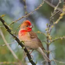酒红朱雀小型鸟类,体长13~15厘米。雄鸟通体深红色,头部深朱红或棕红色,下背和腰玫瑰红色,…
