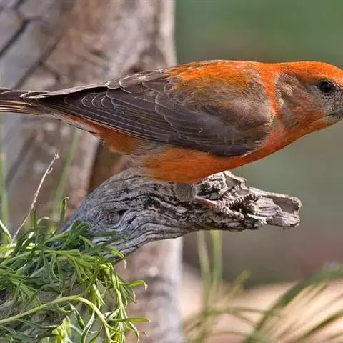 红腰朱雀:体长12-14厘米,小型鸟类。雄鸟前额和眉纹玫瑰粉红色,头顶和一宽的贯眼带深红褐色,背红…