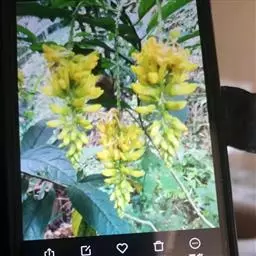 总状花序腋生,花密集,长2厘米,果时延长达6-12厘米,总花梗具纵棱;花小,具小苞片,早落;萼片5,外面3片卵形或三角状卵形,长约1.5毫米,宽1毫米,里面2片花瓣状,长圆形,长约3毫米,宽约2毫米,先端圆形,基部具爪;花瓣3,黄色,侧瓣长圆形,较龙骨瓣稍长,龙骨瓣具2薄片、先端浅裂或不裂的鸡冠状附属物;雄蕊8,花丝3/4以下合生成鞘,花药卵形;子房倒卵形,径约1毫米,花柱由下向上逐渐加宽,并弯曲,呈喇叭状,柱头生于其内。