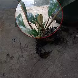 叶腋处生长走茎,匍匐状,顶端生小株,基部可生根。叶对生卵状肉质,基部心形,色绿或绿中带古铜色;叶脉银白色,叶面绿色多皱,中肋及支脉成网纹状。叶背离淡绿或淡红,密生白色软毛,叶缘有细锯齿。
