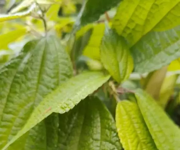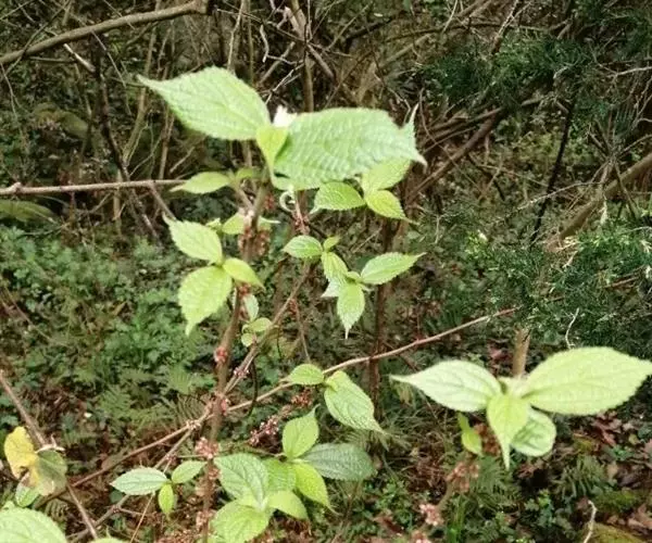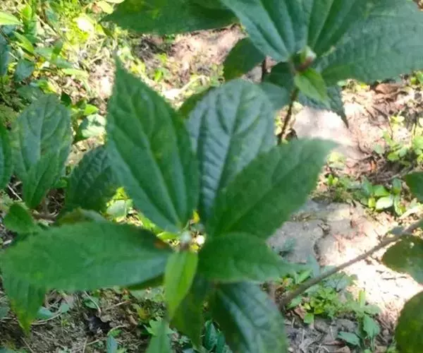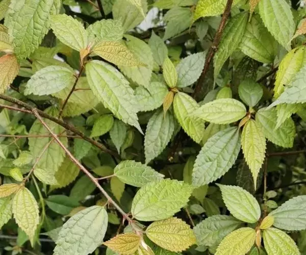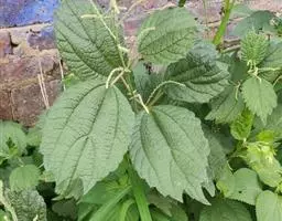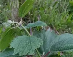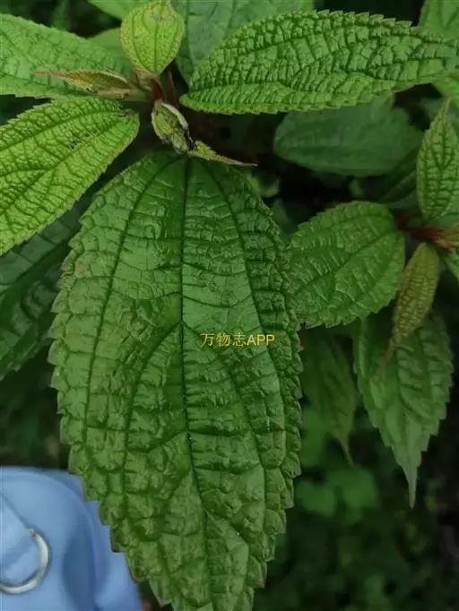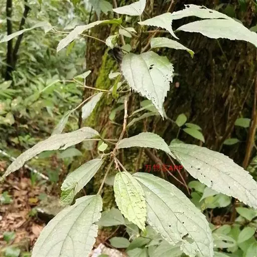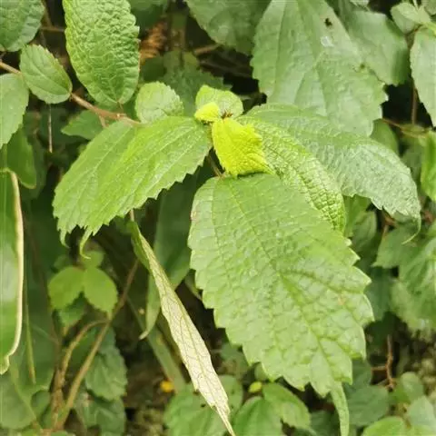 叶常生于枝的上部,草质,以后有时变纸质,卵形、狭卵形、稀倒卵形,长3-15厘米,宽1.5-6厘米,先端渐尖或尾状渐尖,基部圆形,稀宽楔形,边缘自下部以上有锯齿或粗牙齿,上面常疏生糙伏毛,有时近平滑,下面常被灰白色毡毛,以后渐脱落,或只生柔毛或多少短伏毛,基出脉3,其侧出的一对,稍弧曲,与最下一对侧脉环结,侧脉2-3对,在近边缘处彼此环结;叶柄长1-7厘米,被粗毛;托叶条状披针形,长约10毫米,先端尾状渐尖,背面中肋疏生粗毛。