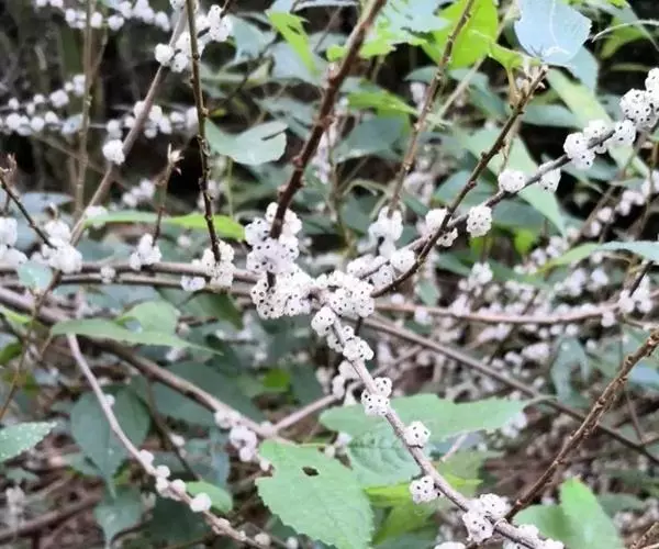 花序生于上年生枝和老枝上,几无梗,呈簇生状,团伞花簇径3-5毫米。雄花在芽时径约1.5毫米;花被片3,在下部合生,长圆状卵形,内弯,外面上部有毛;雄蕊3;退化雌蕊棒状,长约0.6毫米,被白色绵毛。雌花无梗,长1毫米。