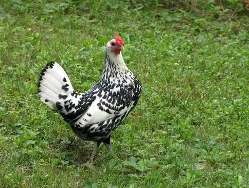 贵妇鸡形态奇特,体型娇小玲珑。冠为羽毛凤冠,成年雄鸡更明显。冠体前有一独立的呈锥形小冠体,冠体为豆冠,冠体两侧为碗状发达的肉质体,延伸为“V”形肉质角状冠,色泽鲜红、细致,后侧形如圆球状的大朵黑白花片羽毛束,好似西洋贵妇人的帽子,因而得名贵妇鸡。