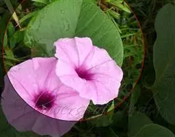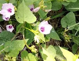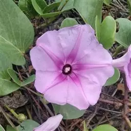 番薯 Lam.),多年生草质藤本植物,具有乳汁;其块根为白、红或黄色;茎生不定根;叶呈宽卵形或卵状心形,叶色有浓绿、黄绿、紫绿等,前端渐尖,基部呈心形或近平截;花冠为粉红、白、淡紫或紫色,呈钟状或漏斗状,无毛;蒴果呈卵形或扁圆形;由于番薯是于异花授粉,自花授粉常不结实,所以有时只见开花不见结果。 种子1-4粒,通常2粒,无毛。番薯原产于南美洲及大、小安的列斯群岛,现已广泛栽培在全世界的热带、亚热带地区,但在一些较北的地区如黑龙江省也已栽种成功,中国大多数地区都普遍栽培。番薯适应性强,喜温暖多光而不耐霜冻,抗旱耐碱,适种于肥沃而排水良好的砂质壤土,是一种易于保收的作物。番薯是一种高产而适应性强的粮食作物,在中国南方,有“一造番薯半年粮”的说法, 与工农业生产和人民生活关系密切;块根除作主粮外,也是食品加工、淀粉和酒精制造工业的重要原料;根、茎、叶可作