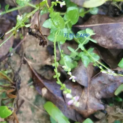 一年生直立草木,高5-25厘米;根纤细,芳香。茎细弱,多分枝,无毛,具狭翅。单叶互生,叶片膜质,卵状心形或心形,长5-16毫米,宽5-12毫米,先端钝,具短尖头,基部心形,全缘或微波状,绿色,无毛,基出3脉;叶柄长1.5-2毫米。