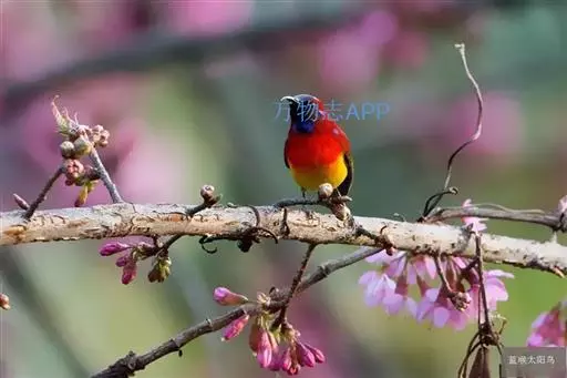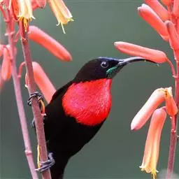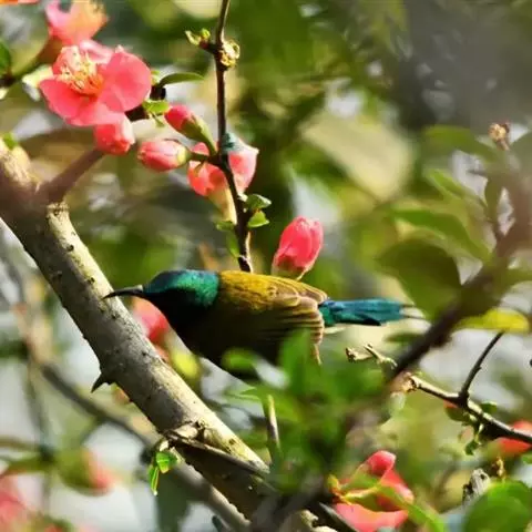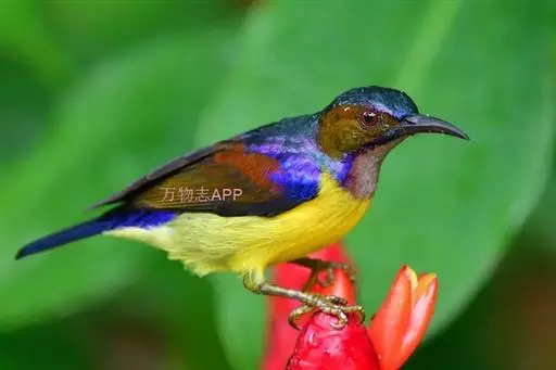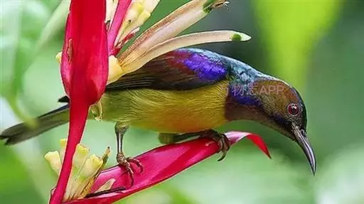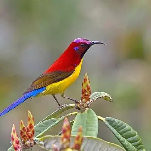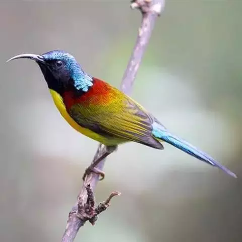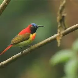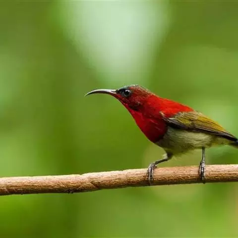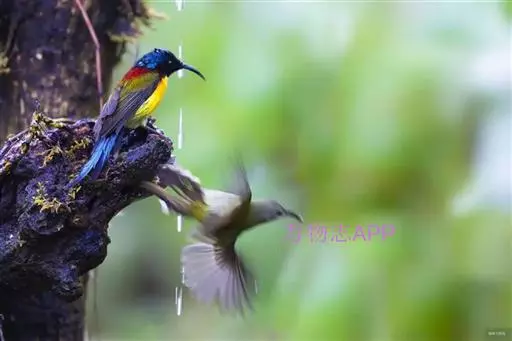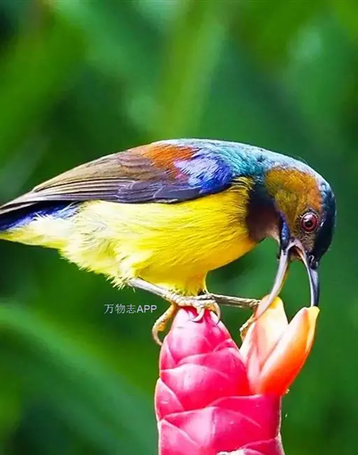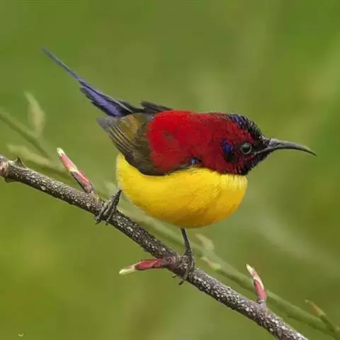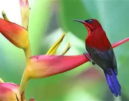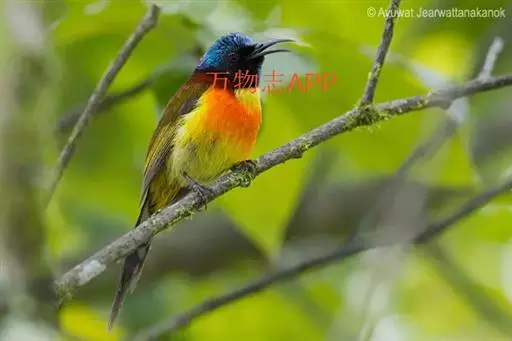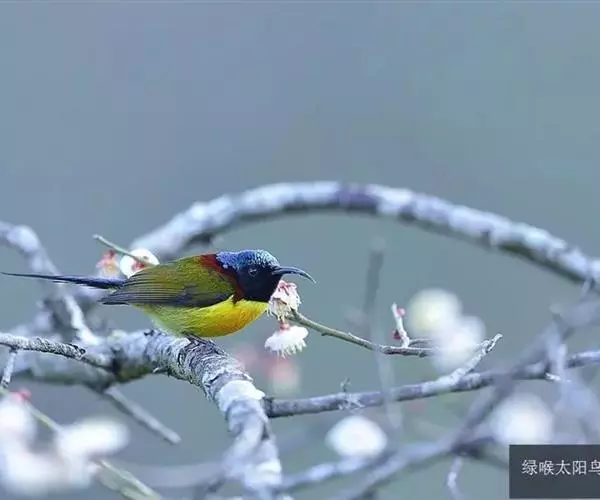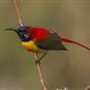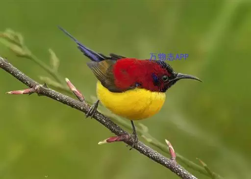 绿喉太阳鸟(学名:Aethopyga nipalensis):共有9个亚种。小型鸟类,雄鸟体长13-15厘米、雌鸟10-12厘米。雄鸟前额至后颈、颏和喉辉绿色,头侧黑色,颈侧和背暗红色,两肩、下背橄榄绿色,腰鲜黄色,尾上覆羽和中央尾羽暗绿色,中央尾羽延长。胸黄色而杂有细的红色纵纹,其余下体黄绿色。雌鸟上体橄榄绿色、颏、喉淡灰绿色,其余下体淡黄色。