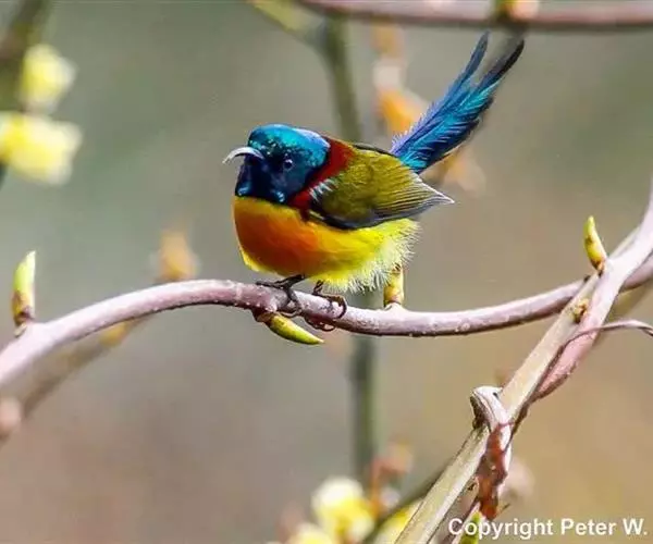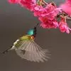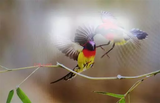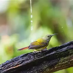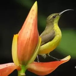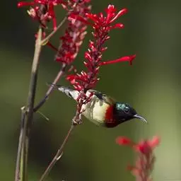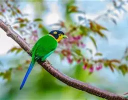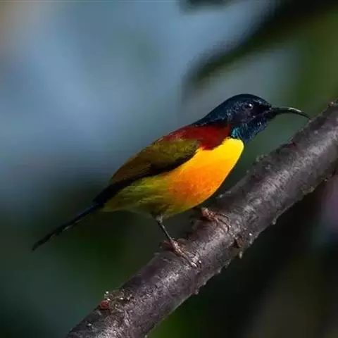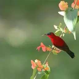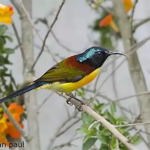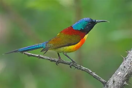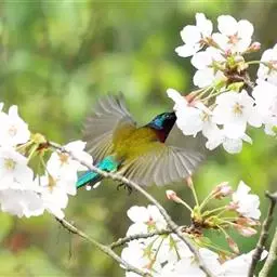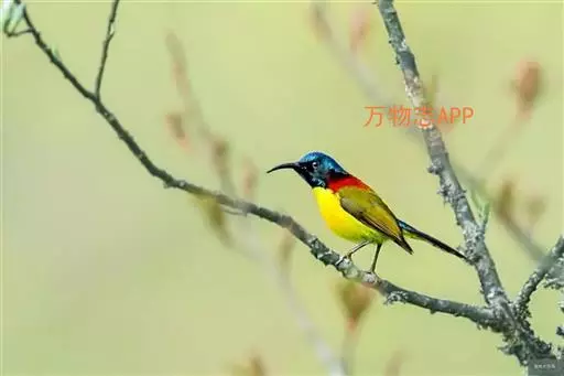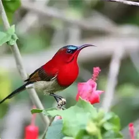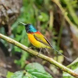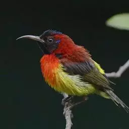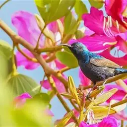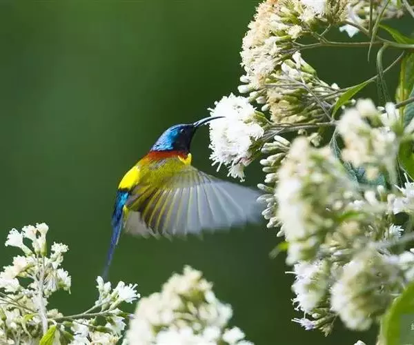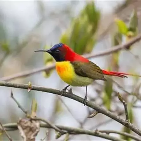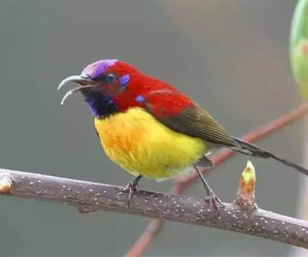 绿喉太阳鸟(学名:Aethopyga nipalensis):共有9个亚种。小型鸟类,雄鸟体长13-15厘米、雌鸟10-12厘米。雄鸟前额至后颈、颏和喉辉绿色,头侧黑色,颈侧和背暗红色,两肩、下背橄榄绿色,腰鲜黄色,尾上覆羽和中央尾羽暗绿色,中央尾羽延长。胸黄色而杂有细的红色纵纹,其余下体黄绿色。雌鸟上体橄榄绿色、颏、喉淡灰绿色,其余下体淡黄色。
