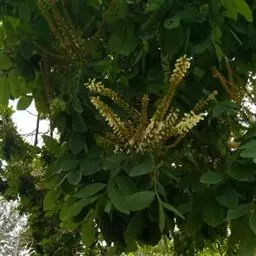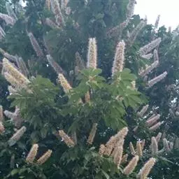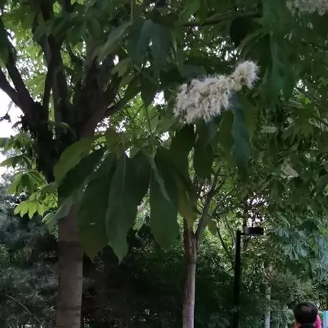 七叶树(学名:Aesculus chinensis Bunge):是落叶乔木,高达25米,树皮深褐色或灰褐色,小枝、圆柱形,黄褐色或灰褐色,有淡黄色的皮孔。冬芽大形,有树脂。掌状复叶,由5-7小组成,上面深绿色,无毛,下面除中肋及侧脉的基部嫩时有疏柔毛外,其余部分无毛。花序圆筒形,花序总轴有微柔毛,小花序常由5-10朵花组成,平斜向伸展,有微柔毛。花杂性,雄花与两性花同株,花萼管状钟形,花瓣4,白色,长圆倒卵形至长圆倒披针形。果实球形或倒卵圆形,黄褐色,无刺,具很密的斑点。种子常1-2 粒发育,近于球形,栗褐色;种脐白色,约占种子体积的1/2。花期4-5月,果期10月。