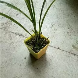 准备好兰盆及植料后,将兰株倒拿(根在上,叶在下)放于水龙头下以慢水冲洗,但水压切忌过强,以免伤兰根及叶子。用拇指和食指抓住兰头,小指抵住盆缘,用竹筷将根固定,当放入盆内时,尽量不要让根接触到盆壁。将豆粒大的混合石砾倒入盆底至三分之一处。然后倒入中粒植料至五分之四处,填实和尽量不要留下空间。将竹筷拔出,并摇实盆中植料。填实植料后,再用大粒植料埴入至距盆缘1.5厘米处。最后再倒入豆粒大植料,以将假鳞茎全部埋入土中为度,然后充分摇实。用压土工具轻压植料,并将表面弄平。种植完毕后,植料在盆中以中央稍高为好。