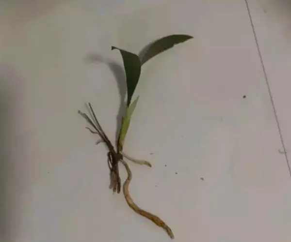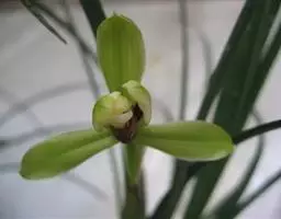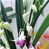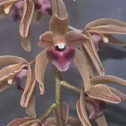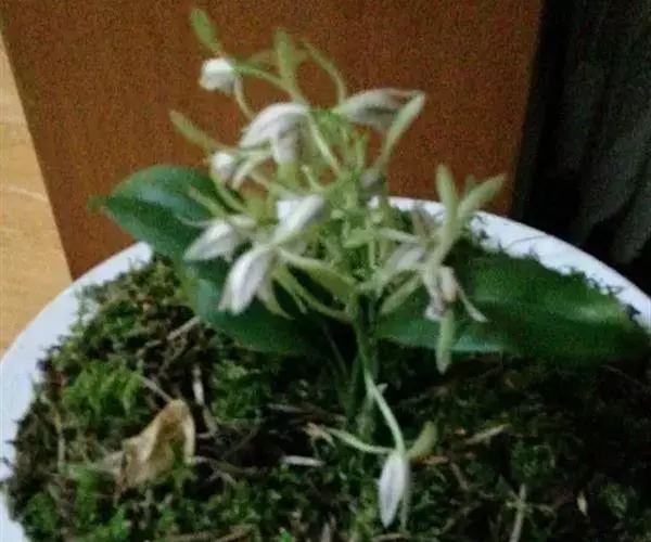 花葶从假鳞茎下部侧面节上发出,直立,长8-20厘米或更长;花序具2-6朵花,较少减退为单花或具更多的花;花苞片披针形,长1-1.5厘米;花梗和子房长2-2.5厘米;花通常白色至淡绿色,花瓣上有紫栗色中脉,唇瓣上有紫栗色斑;萼片倒披针状长圆形,长2.2-2.7(-3)厘米,宽5-7毫米。