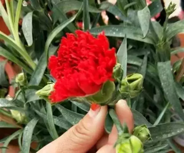 4.其它:为促使康乃馨多枝多开花,需从幼苗期开始进行多次摘心:当幼苗长出8至9对叶片时,进行第一次摘心,保留4~6对叶片;待侧枝长出4对以上叶时,第二次摘心,每侧枝保留3~4对叶片,最后使整个植株有12~15个侧枝为好。孕蕾时每侧枝只留顶端一个花蕾,顶部以下叶腋萌发的小花蕾和侧枝要及时全部摘除。第一次开花后及时剪去花梗,每枝只留基部两个芽。