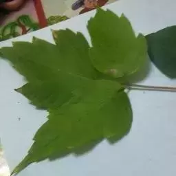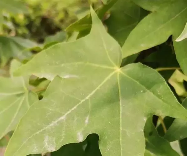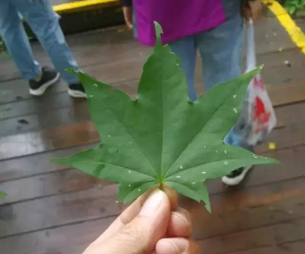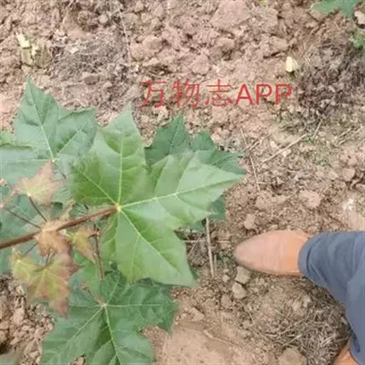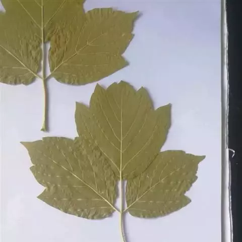 叶纸质,基部截形或近于心脏形,叶片的外貌近于椭圆形,长6-8厘米,宽9-11厘米,常5裂,有时3裂及7裂的叶生于同一树上;裂片卵形,先端锐尖或尾状锐尖,全缘,裂片间的凹缺常锐尖,深达叶片的中段,上面深绿色,无毛,下面淡绿色,除了在叶脉上或脉腋被黄色短柔毛外,其余部分无毛;主脉5条,在上面显著,在下面微凸起,侧脉在两面均不显著;叶柄长4-6厘米,细瘦,无毛。