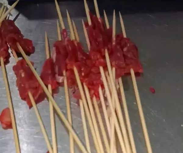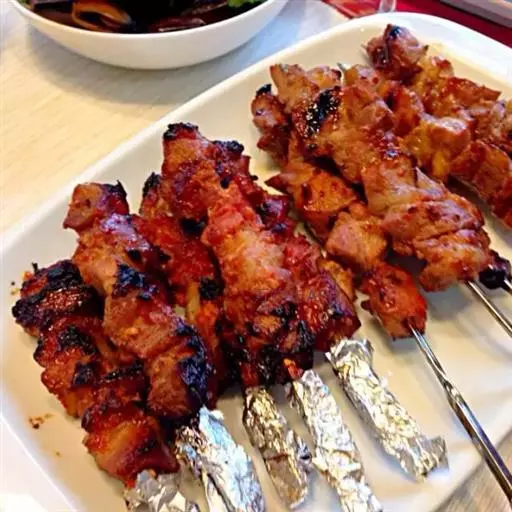 1.羊肉切成小块(每块10克,即约切成25块),用胡椒粉、盐、醋、洋葱末腌2小时,然后穿在短竹扦上,共穿5串;