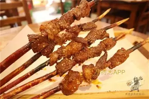 在新疆无论到哪里都有烤羊肉串。库车有一种"米特尔喀瓦甫"(一米长的羊肉串),这种巨型羊肉串,吃起来才过瘾,吃上2-3串,即可饱肚。