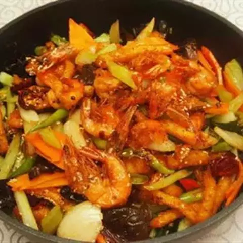 炒大虾是一道菜品,制作原料有大对虾、葱段、姜片等,用微火焖烤透,再将勺移正火,收汁微浓时放入味精,…