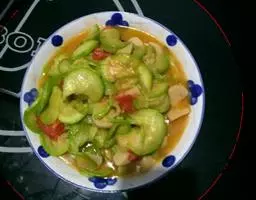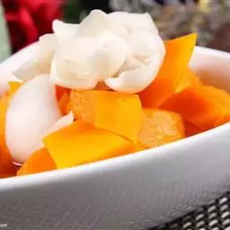 3、油烧热.放入南瓜、百合.调入调味料炒匀.用生粉勾芡即可出锅。