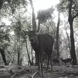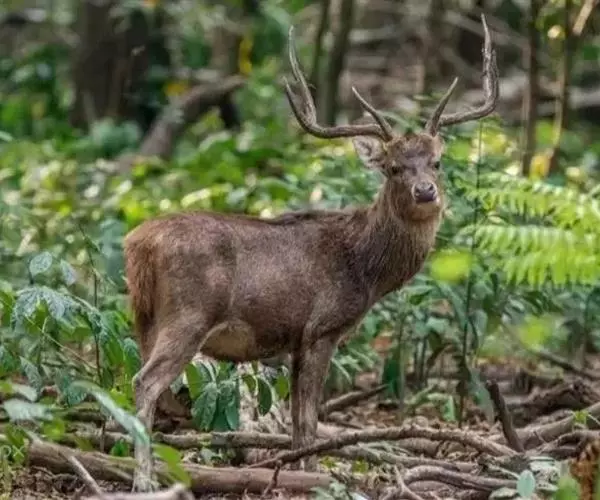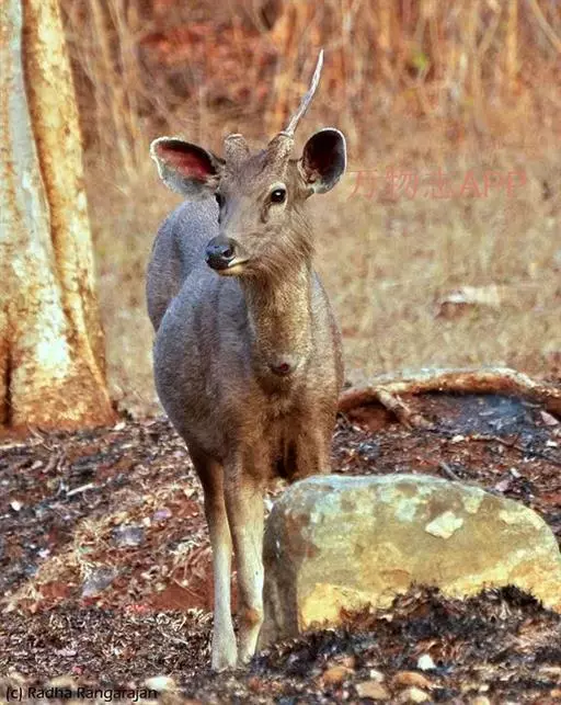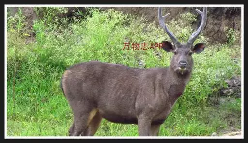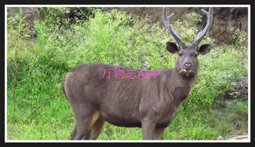 水鹿(学名:Rusa unicolor)体型粗壮接近马鹿。成年雄鹿体高130 厘米左右,体长130-140 厘米,体重200-250 千克。雌鹿较矮小。水鹿泪窝较大,鼻镜黑色,颈毛较长,尾端部密生蓬松的黑色长毛。被毛黑褐色,冬毛深灰色。有黑棕色背线,臀周围呈锈棕色,无臀斑。茸角为单门桩,眉枝。喜水,常活动于水边,栖息于阔叶林、混交林、稀树的草场和高草地带,清晨、黄昏觅食。雨后特别活跃。平时单独活动,有一定的行动路线。分布于中国、斯里兰卡、印度、尼泊尔、中南半岛以及东南亚等地区。