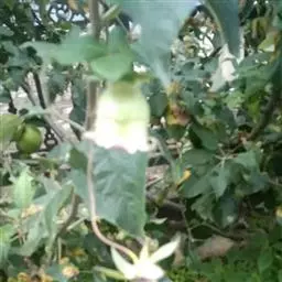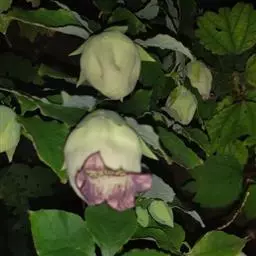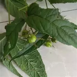 花单生于枝端,与叶柄互生或近于对生,有梗。花萼贴生至子房中部,筒部半球状,裂片宽披针形或狭矩圆形,长1-2厘米,宽约6-8毫米,顶端钝或微尖,微波状或近于全缘,其间湾缺尖狭;花冠上位,阔钟状,长约1.8-2.3厘米,直径1.8-2.5厘米,黄绿色,内面有明显紫斑,浅裂,裂片正三角形,端尖,全缘;花丝基部微扩大,长约5毫米,花药长形,长5-6毫米;柱头有白色刺毛。蒴果下部半球状,上部短圆锥状。种子多数,卵形,无翼,细小,棕黄色,光滑无毛。花果期7-10月。