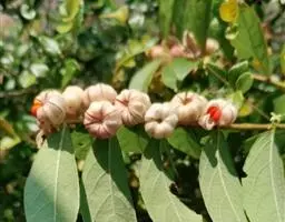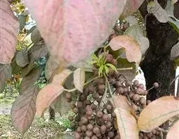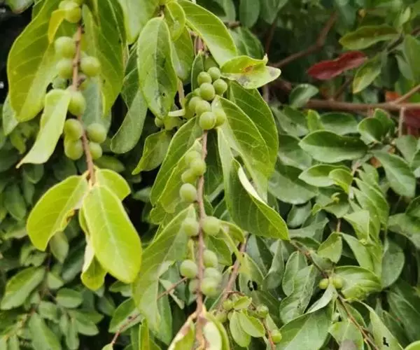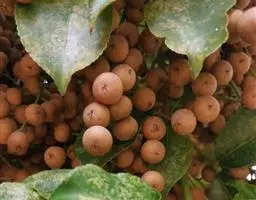 核果近圆球形,直径4-7毫米,2室;种子褐红色,长卵形,长3.5-4毫米,宽约3毫米,腹面压扁状,有纵槽,背面稍凸起,有纵条纹。花果期几乎全年。
