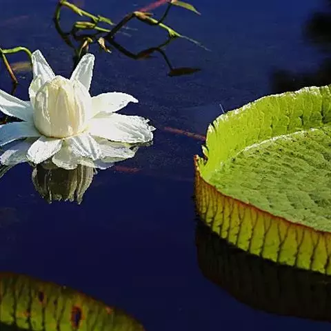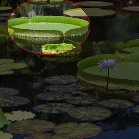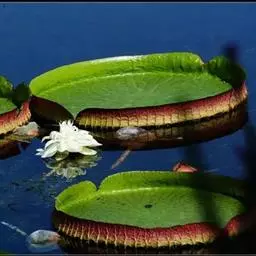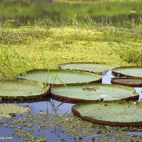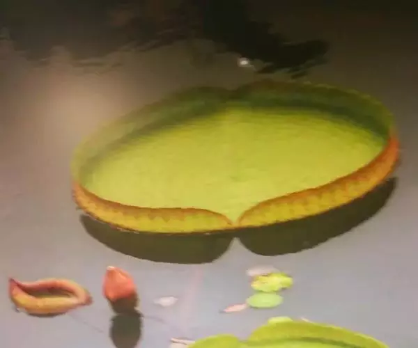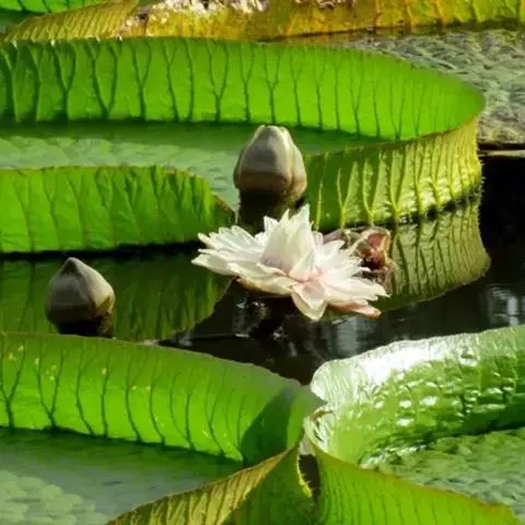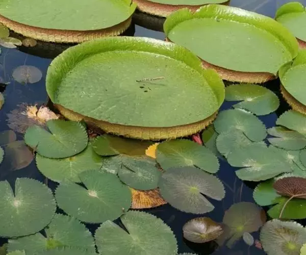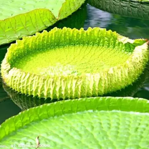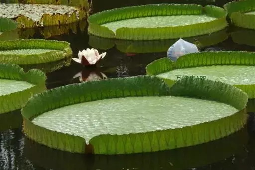 属睡莲科多年生或一年生大型浮叶草本。有直立的根状短茎和发达的不定须根,白色。果实成熟时,内含五六百粒种子,大小形状似豌豆,含有丰富淀粉,可食用,南美洲人因此称之为“水玉米”。王莲是水生有花植物中叶片最大的植物,其初生叶呈针状,长到2~3片叶呈矛状,至4~5片叶时呈戟形,长出6~10片叶时呈椭圆形至圆形,到11片叶后叶缘上翘呈盘状,叶缘直立,叶片圆形,像圆盘浮在水面,直径可达2米以上,叶面光滑,绿色略带微红,有皱褶,背面紫红色,叶柄绿色,长2~4m,叶子背面和叶柄有许多坚硬的剌,叶脉为放射网状。