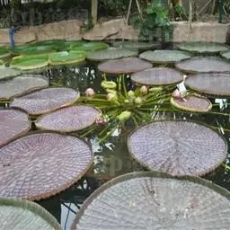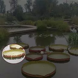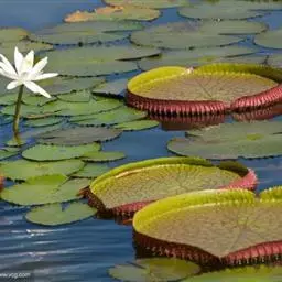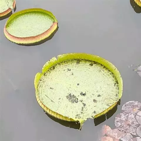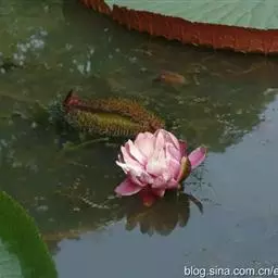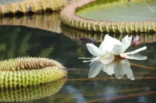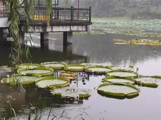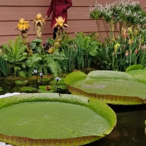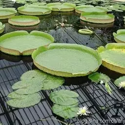 王莲是水景园中的瑰宝,口十片为圆形,叶片边缘向上卷曲,整个叶面浮于水面,十分奇特。王莲的单花花期仅三天,每天的颜色还不相同,开花时花蕾伸出水面,第一天开白色并伴有芳香,第二天变为粉红色,第三天则变为紫红色,然后闭合沉入水中,种子在水中成熟。 王莲主要有‘克鲁兹’王莲和‘亚马逊’王莲2个栽培种,‘克鲁兹’王莲的耐寒性、抗逆性较‘亚马逊’王莲强,栽培也较为容易,北方地区多引种 和栽培此种。‘克鲁兹’王莲叶片直径1.5m~1.8m,边缘直立可达10cm~15cm,叶背叶脉呈深红色,一般于8月中旬至9月开花。