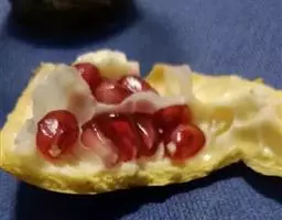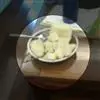 3、将芒果摆在盘中,拼盘出造型后,浇上调好的沙拉汁,旁边可点缀食品雕刻花即可上桌食用。