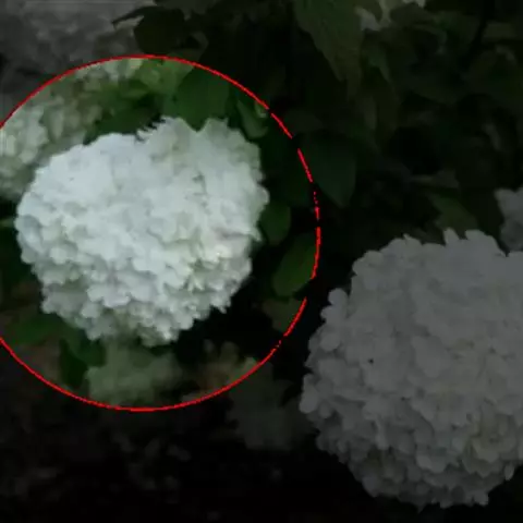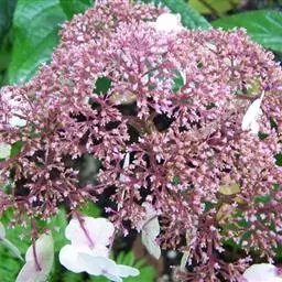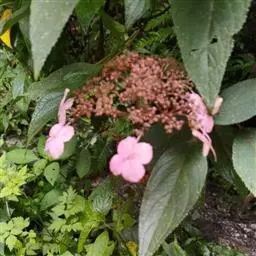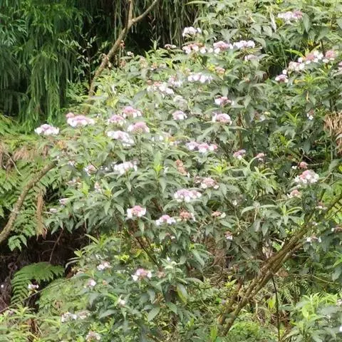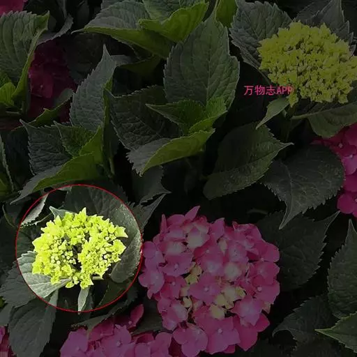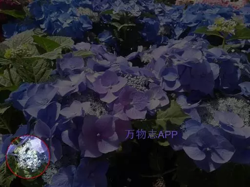 伞房状聚伞花序近球形,直径8-20厘米,具短的总花梗,分枝粗壮,近等长,密被紧贴短柔毛,花密集,多数不育;不育花萼片4,阔物卵形、近圆形或阔卵形,长1.4-2.4厘米,宽1-2.4厘米,粉红色、淡蓝色或白色;孕性花极少数,具2-4毫米长的花梗;萼筒倒圆锥状,长1.5-2毫米,与花梗疏被卷曲短柔毛,萼齿卵状三角形,长约1毫米;花瓣长圆形,长3-3.5毫米;雄蕊10枚,近等长,不突出或稍突出,花药长圆形,长约1毫米;子房大半下位,花柱3,结果时长约1.5毫米,柱头稍扩大,半环状。